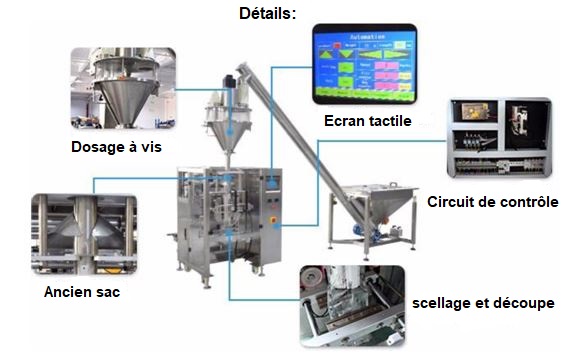 -La machine à emballer les poudres peut compléter automatiquement tout le processus de production: alimentation, mesure, remplissage et fabrication de sacs, impression de la date, sortie du produit.